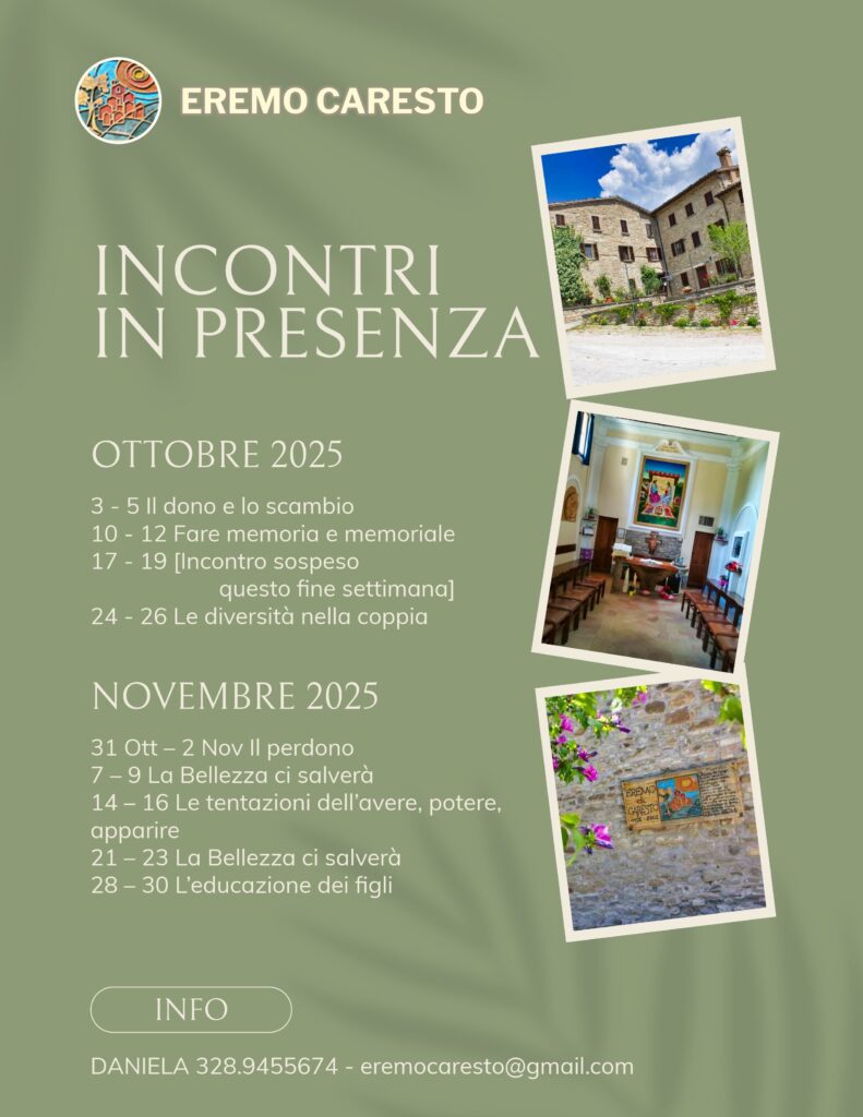 Gli incontri in presenza dei mesi di Ottobre e Novembre 2025.Per informazioniDanielaCell. 328.9455674Mail. eremocaresto@gmail.com